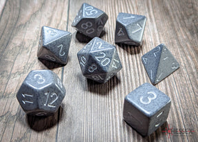 This set contains 7 Speckled Hi-Tech dice with silver numbers with the following shapes: